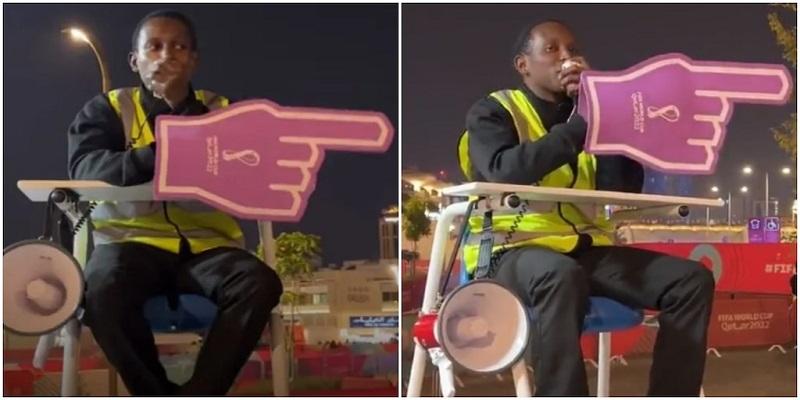 وإذا لم تكن سمعت عنه فسأحكي لك عنه، أبو بكر عباس هو شاب كيني الجنسية عمره 23 عام تقدم لأن يحصل على وظيفة طوال فترة المونديال في قطر، وكان من نصيبة مهمة روتينية سخيفة، وهي أن يجلس لمدة 9 ساعات على مقعد في الشارع في اتجاه محطة المترو بجوار الاستاد، وبعد المباراة يوجه أبو بكر الجمهور الخارج من الاستاد إلى محطة المترو، يرتدي قفاز ضخم لونه عنابي يشبه علامة لايك على الفيس بوك ويوجهها نحو طريق المترو، ويردد جملة واحدة طوال الوقت وهي: “Metro This Way” “المترو من هنا”.
