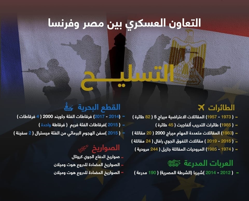 وقع البلدان على مدار العقود الماضية في عهد الرئيس السيسي، العديد من اتفاقيات التعاون العسكري، أبرزها اتفاق للتعاون العسكري والفني تم توقيعه خلال زيارة وزير الدفاع الفرنسية أليو ماري إلى مصر في يونيو 2005. بشكل عام يتم بشكل سنوي مناقشة أوجه التعاون العسكري بين الجانبين من خلال اجتماعات دورية تعقدها اللجنة العسكرية المشتركة بين البلدين، وهي لجنة تم تأسيسها عام 1988، ويرأسها من الجانب الفرنسي نائب رئيس العلاقات الدولية في هيئة أركان حرب القوات المسلحة الفرنسية، ناهيك عن اجتماعات سنوية أخرى تُعقد في باريس بين وزراء دفاع ورؤساء أركان جيوش كلا الجانبين، كما ينفذ كلا البلدين ما متوسطة 50 نشاط عسكري مشترك، ما بين التدريب والحوار الاستراتيجي والاجتماعات على مستوى كبار القادة والمناورات العابرة والأساسية.