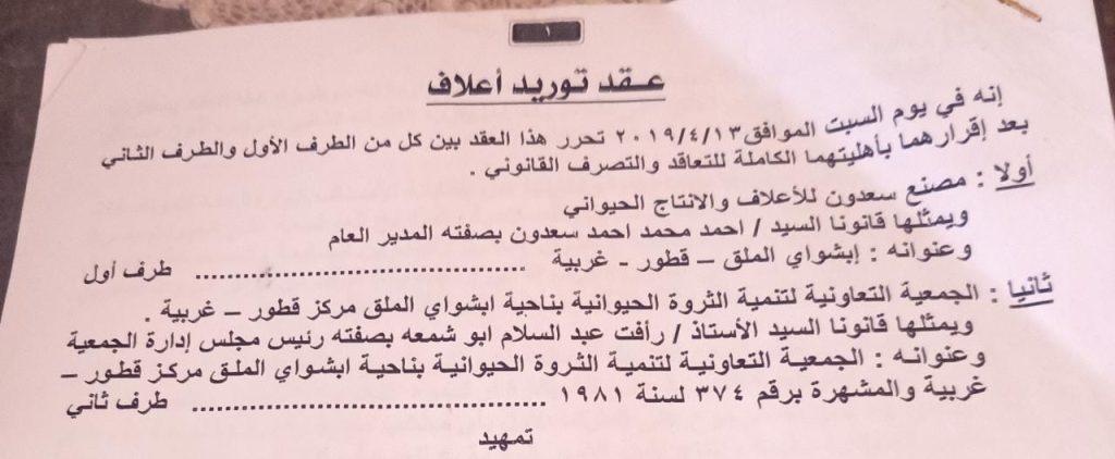 ومن الشركات التي تعاقدت معها الجمعية شركة ” فيدميكس” ووكيلها ” محمد البنا ” وقد أطلعتنا الجمعية على بنود العقد وتراخيص الشركة من قبل الزراعة بالإضافة إلى السجلات الضرابية وهو ما أكده وكيل الشركة في تصريح لـ ” الميزان” ، والخلاف أيضًا كان حول السعر لنفس الأسباب المذكورة سابقًا.