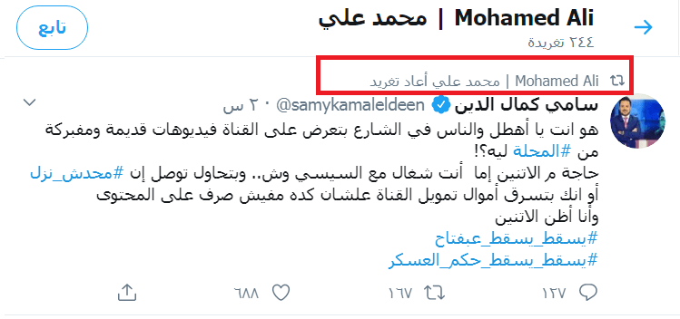 حاول محمد علي استخدام صفحته لإقناع المصريين بالنزول فقام برفع فيديو زعم فيه خروج مظاهرات ليلية في الجيزة، وبعد دقائق قام بنشر نفس الفيديو في منشور جديد وقال أنه في المحلة، مما أثار غضب سامي كمال الدين فكتب تغريدة هاجم فيها المقاول الهارب وقال «هو انت يا أهطل والناس في الشارع بتعرض على القناة فيديوهات قديمة ومفبركة من المحلة ليه؟! حاجة من الاتنين إما أنت شغال مع السيسي وش.. وبتحاول توصل إن محدش نزل أو انك بتسرق أموال تمويل القناة علشان كده مفيش صرف على المحتوى وأنا أظن الاتنين»؛ والعجيب أن محمد علي أعاد تغريدة سامي كمال الدين الذي يشتمه أصلاً.