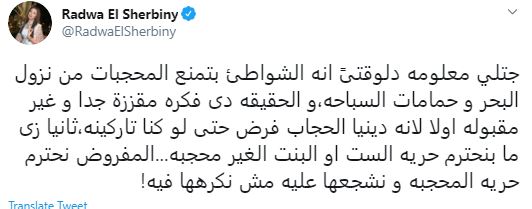 “جت لي معلومة دلوقتي إن الشواطىء بتمنع المحجبات من نزول البحر وحمامات السباحة، والحقيقة دي فكرة مقززة جدًا وغير مقبولة؛ أولا لأن دينيا الحجاب فرض حتى لو كنا تاركينه، ثانيا زي ما بنحترم حرية الست أو “البنت الغير محجبة المفروض نحترم حرية المحجبة ونشجعها عليه مش نكرهها فيه