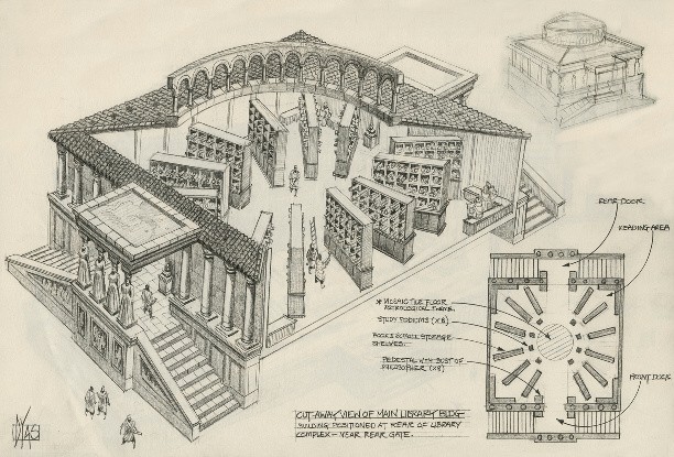 أما المؤرخ أميانوس مارسيلينوس في كتاب مصر في القرن الرابع فيقول «كانت مكاتب الإسكندرية لا تقوم بثمن واتفق الكتاب الأقدمون على أنها كانت تحوي 700 ألف كتاب بذل في جمعها البطالمة جهدًا كبيرًا ولقوا في سبياء ذلك عناءًا عظيمًا، وقد أحرقتها النيران في حرب الإسكندرية عندما غزاها يوليوس قيصر وضربها».