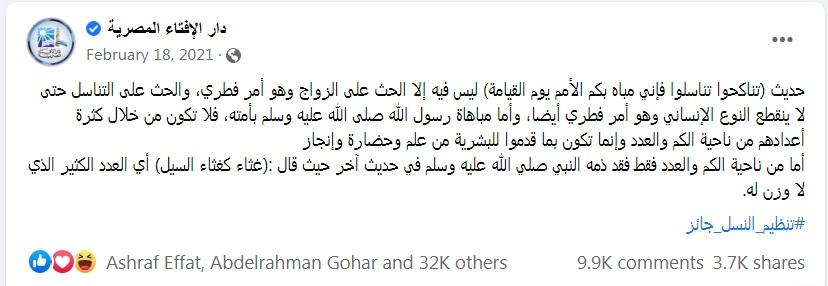 هنا أنا مش بناقش صحة الأحاديث من عدمها، إنما بأشاور على شكل الخطاب الديني ودوافعه، خطاب وصل تأثيره إنه وقف حجر عثر قصاد مشروع الدولة تنظيم الأسرة. خطاب يؤكد وجوده ومدى هيمنتهه محاولة المؤسسة الإسلامية “الرسمية” الرد عليه (لأسباب تخص المسألة السكانية فقط لا غير)، وطبعًا أغلبنا عارف مستوى ردود الناس على صفحة دار الإفتاء لما بتفتي.