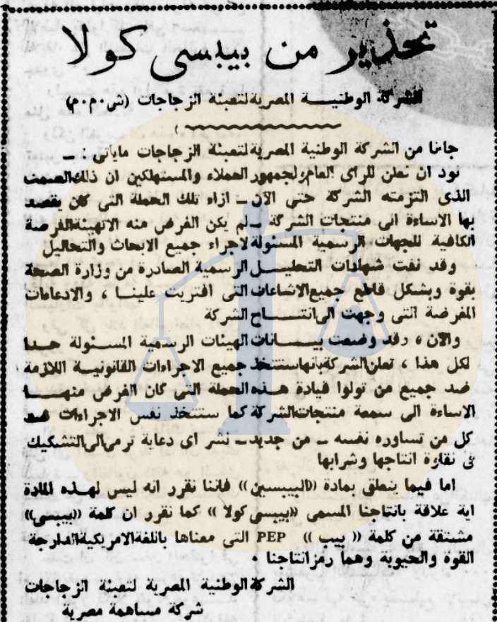 في 16 سبتمبر عام 1951 أصدر الشركة الوطنية المصرية لتعبئة الزجاجات بيانًا ذكرت فيه أن صمتها لم يكن سوى تهيئة الفرصة الكافية للجهات الرسمية المسئولة لإجراء جميع الأبحاث والتحاليل والتي أثبت كذب ما يقال، وأن الشركة ستتخذ إجراءات قانونية ضد كل الذين تولوا قيادة حمله تشويه بيبسي.