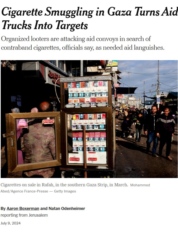 بعد قراية كتير من البيانات والبوستات وصلت لاكتشاف ظريف جدًا، فيه جنود إسرائيليين فَسَدة عاملين عصابة وبيهربوا بضايع ممنوعة وسط المعونات وهي داخلة القطاع؛ ومن أهم البضايع دي “الدخان” أو “السجاير”.