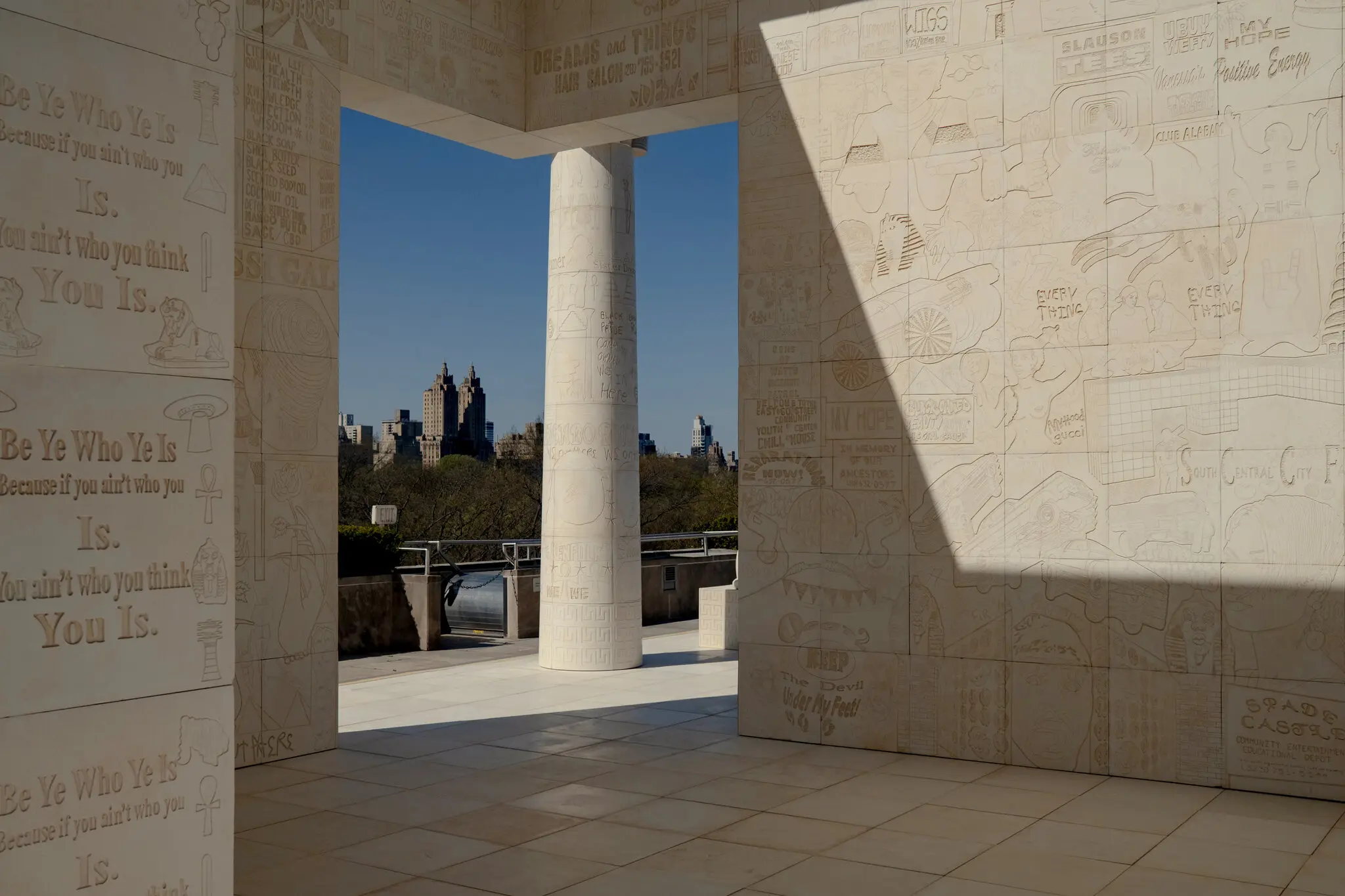 من وقت لآخر، يقيم متحف المتروبوليتان للفنون معارض على سطحه لتسليط الضوء على الفنانين. هذا الشهر تم دعوة الفنانة لورين هالزي لإقامة معرض خاص بها. كان اختيارها لهذا المعرض هو مبنى من الطراز المصري القديم للمعابد يزينه الجرافيتي وأربعة تماثيل شبيهة لأبو الهول. لكنها غيرت ملامح تماثيلها لملامح أفريقية في حلقة جديدة من المركزية الأفريقية. كما صور الجرافيتي الموجود على الحوائط أمريكيين من أصل أفريقي.