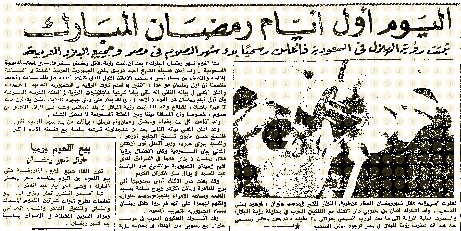 مع الساعة السابعة وعشر دقائق من مساء السبت 29 شعبان 1384 = 2 يناير 1965 بدأ الاحتفال برؤية هلال رمضان عبر إذاعة البرنامج العام وإذاعة القرآن الكريم، وكان القارئ هو الشيخ عبدالباسط عبدالصمد، وفي الساعة الثامنة والنصف جاء بيان مفتي الديار المصرية حول هلال رمضان.