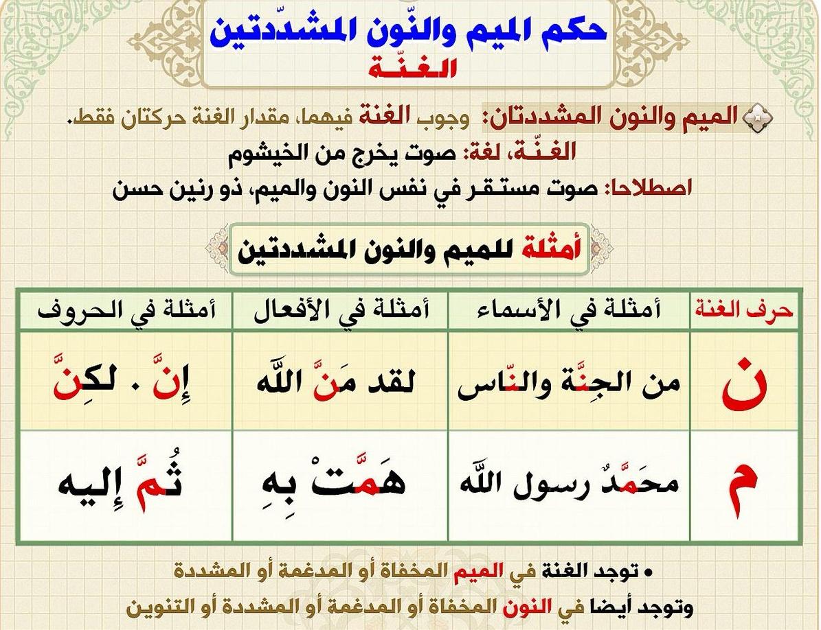 وقال الجزري في البيت 62 من متن الطيبة وأَظْهِرِ اْلغُنَّةَ مِنْ نُونٍ وَمِنْ مِيمٍ إِذاَ مَا شُدِّدَا وَأَخْفِيَنْ.